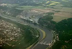 Ohyb Vltavy u Roztok. Město leží na levém břehu, na pravém břehu je vidět lom v Klecanech