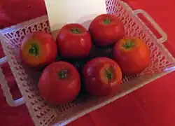 Plod je kulovitý, střední. Slupka suchá, bledě zelené zbarvení, které během skladování žloutne, je překryté oranžovou barvou s červeným žíháním. Dužnina je krémová s nasládlou chutí, aromatická.[2]