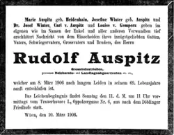 - ↑ a b c d Bývalý poslanec Rudolf Auspitz zemřel. Národní listy. Březen 1906, roč. 46, čís. 67, s. 1. Dostupné online.