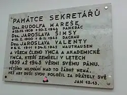 Pamětní deska "Obětem 2. světové války" je umístěná ve vestibulu paláce YMCA (v budově na adrese: Na Poříčí 1041/12; 110 00 Praha 1 – Nové Město). Pamětní deska připomíná tři sekretáře organizace YMCA, kterými byli: Rudolf Mareš (1909–1944), Jaroslav Šimsa (1900–1945) a Jaroslav Valenta (1911–1942), kteří zemřeli v letech nesvobody 1939 až 1945 a kteří se účastnili protinacistického odboje.[24]