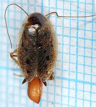 Je to velmi čile se pohybující šváb. Objevuje se od května do září, v závislosti na počasí.[2] Samečci obvykle bývají na nízkých rostlinách a samičky na zemi.[1] Snášená vajíčka jsou chráněná ootékou dlouhou asi 3 mm. Nymfy se líhnou po 2-3 měsících.[2] Přezimují nymfy.[1] Dospělci jsou všežravci.
