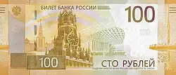 100 rublů | 150 × 65 mm | oranžová | Centrální Rusko | Dominanty Moskvy | Rževský památník sovětským vojákům | |