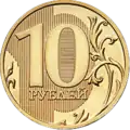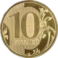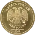 10 rublů | 22 mm | 5,63 g | Pomosazovaná ocel | Kulatá, střídavě hladká a vroubkovaná (6 částí o pěti vroubcích a 6 částí po sedmi vroubcích se střídá s 12 hladkými částmi) | Znak Ruské banky | Nominální hodnota | 2009–2015 |