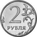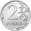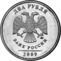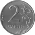 2 rubly | 23 mm | 5,10 g | Mědinikl | Kulatá, střídavě hladká a vroubkovaná (84 vroubků rozdělených do 12 částí se střídá s 12 hladkými částmi) | Znak Ruské banky | Nominální hodnota | 1997–2009 |
