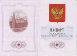 - Stránka 1 - V horní části je reprodukován barevný obrázek Státního znaku Ruské federace. Uprostřed (pod státním znakem) jsou ve třech řádcích ornamentálně vytištěna slova „pas občana Ruské federace“. Pod slovy je typografická kresba "rozeta".