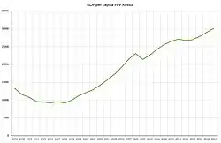 S restrukturalizací hospodářství vznikla vrstva extrémně bohatých a extrémně chudých obyvatel. V roce 1998 vyhlásilo Rusko státní bankrot.[71][72] Až za vlády prezidenta Putina se začala hospodářská situace zlepšovat, zlepšilo se splacení ruských dluhů v důsledku růstu cen ropy a zemního plynu, jehož je Rusko významným exportérem. Výrazně vzrostly kapitálové investice. Na druhou stranu ale přibývala nová rizika, jako například terorismus nebo separatismus jednotlivých republik.