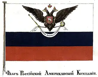 Rusko-americká společnost byla první polostátní institucí, které ruská vláda udělila specifickou vlajku. Do té doby se všechny společnosti, včetně soukromých, musely reprezentovat pod vlajkou carského Ruska. Vlajka byla schválena carem Alexandrem I. Pavlovičem a téhož roku vstoupila v platnost. Zaměstnancům společnosti bylo řečeno, aby ji používali jako námořní a válečnou vlajku, nicméně byla využívána i pro diplomatické účely. Vlajku tvořily tři pruhy ve stejných barvách i pořadí jako má vlajka ruská, avšak horní bílý pruh byl výrazně širší. Na bílém pruhu byl umístěn dvojhlavý orel, jenž v drápech držel bílou stuhu, částečně zasahující do modrého pruhu, s nápisem Rusko-americká společnost (tehdejší dobovou ruštinou Россiйской Американской компанiи) a carské klenoty. Na orlí hrudi byl rudý štít se symbolem svatého Jiří. Poloha orla byla buď uprostřed „plátna“, anebo mírně posunuta do jeho levého rohu (viz obrázky vlajek). Ze začátku si společnost pro vytváření svých symbolů najímala mnoho umělců, později však od tohoto upustila.