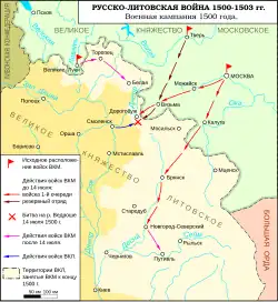 Nepřátelství znovu propuklo v květnu 1500. Záminkou se stala snaha Alexandra, aby jeho žena Helena konvertovala ke katolicismu. Otec Ivan III. jí to zakázal a začal využívat náboženskou otázku k zesilování tlaku na Litvu. Využil přitom plánovaného polsko-maďarského tažení proti Osmanské říši, díky němuž nehrozilo, že by Poláci a Maďaři mohli poskytnout Litvě efektivní pomoc, a zahájil útok. Okamžitě dobyl litevské pevnosti v Brjansku, Vjazmě, Dorogobužu, Toropecu a Putyvlu. Místní šlechtici, zejména Vorotynskové, se přitom připojovali k Rusům.