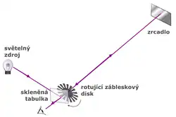 První úspěšné měření rychlosti světla pozemním přístrojem provedl v roce 1849 francouzský fyzik Hippolyte Fizeau. Fizeauv experiment byl koncepčně podobný návrhům Beeckmana a Galilea. Paprsek světla byl namířen na zrcadlo umístěné ve vzdálenosti 8633 m. Na cestě od zdroje světla k zrcadlu paprsek procházel rotujícím diskem se zářezy. Při určité rychlosti rotace disku projde paprsek směrem od zdroje jedním zářezem a při návratu zářezem následujícím. Jestliže dojde třeba i jen k malému zrychlení nebo zpomalení rotace disku, zasáhne zpětný paprsek samotný disk (jeho zub) a nedostane se nazpět. Rychlost světla se dá vypočítat ze známé vzdálenosti zdroje a zrcadla, počtu zářezů (resp. zubů) na disku a rychlosti rotace. Rychlost světla publikovaná Fizeaem byla 313 000 kilometrů za sekundu.[9]) Fizeauova metoda byla později zdokonalena M. A. Cornuem (1872) a J. Perrotinem (1900).[zdroj?]