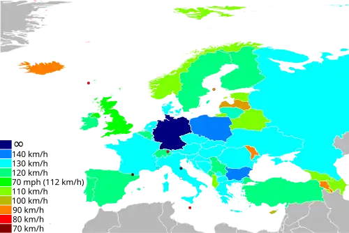 Téměř ve všech zemích Evropy existují rychlostní limity pro všechny druhy silnic a motorových vozidel; některé z limitů (např. 90 km/h v Česku) se nevztahují na nemotorová vozidla.[zdroj?] Nejznámějším příkladem neomezené rychlosti jsou německé dálnice, kde existuje pouze doporučená rychlost 130 km/h. Nicméně zhruba na třetině jejich celkové délky existuje omezení rychlosti dané místním dopravním značením.