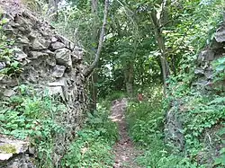 Hrad byl dvojdílné dispozice. Předhradí má tvar trojúhelníka s rozměry 30 × 25 metrů) a byla na něm zřejmě jen dřevěná zástavba. Ze dvou stran bylo chráněno příkopem a valem. Na straně přístupové šíje se dochoval pouze příkop široký 10–18 metrů. Další příkop o šířce 17 metrů a hloubce až 6,5 metru je částečně vylámán ve skále a odděloval předhradí od zděného hradního jádra o rozměrech (55 × 30 metrů).[5]