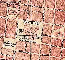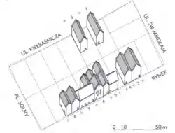 V severovýchodním rohu bloku prostřední zástavby Rynku stála ve 13. století budova s neurčitým využitím. Její pozůstatky byly objeveny během prací prováděných na Rynku v letech 1995–1997. Budova byla skeletové konstrukce a její stěny byly z latí.[23] Délka budovy byla asi 8,2 m a šířka 5,6 m.[61] Na stejném místě byla na konci 19. století postavena zděná toaleta, která fungovala do roku 1945.[62]