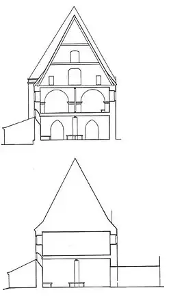 Na severozápadní straně radniční věže byla budova slévárny kovů, kde se ruda tavila, čistila a razily se zde kovové mince. Nejstarší prameny zmiňující tuto stavbu pocházejí z roku 1299 a její polohu lze přibližně určit na základě listiny z roku 1423. Díky archeologickým průzkumům, provedeným v roce 1997, byly objeveny její základy. Její východní stěna byla prodloužením západní strany věže na sever a jižní stěna pokračovala západně od středu věže. Budova byla postavena na lichoběžníkovém půdorysu, vnitřní prostor budovy byl 5,1 m severně k jihu, 2,4 m podél jižní stěny a 3,8 m podél severní stěny. Na základě kresby Friedricha Bernharda Wernera[51] lze předpokládat, že stavba byla jednopatrová a na západě krytá dvěma rovnoběžnými střechami, uzavřená renesančními štíty s pilastry a S-profily. Podobné štíty byly umístěny na přízemním vestibulu postaveném na jižní straně.[48]