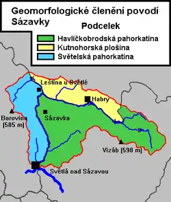 Celé povodí Sázavky se nachází v geomorfologickém celku Hornosázavská pahorkatina. Údolí říčky tvoří rozhraní mezi jednotlivými jejími podcelky.[3] Všechny její levostranné přítoky a pravostranné přítoky po Jiříkovský rybník odvodňují severozápadní část Havlíčkobrodské pahorkatiny. Nejvyšším bodem této části povodí je vrch Vizáb (598 m), který se nachází západně od Sedletína a je současně i nejvyšším bodem celého povodí. Říčka odvodňuje jeho severní a severovýchodní úbočí. Pravostranné přítoky od Jiříkovského rybníka po Leštinu u Světlé odvodňují jižní část Kutnohorské plošiny. Zbývající pravé přítoky od Leštiny u Světlé po ústí spolu s převážnou částí povodí potoka Leštiny odvodňují východní část Světelské pahorkatiny. Nejvyšším bodem této části povodí je vrch Borovina (585 m), který se nachází jihozápadně od Kynic. Sázavka odvodňuje jeho severovýchodní úbočí.