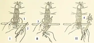 Celá síť sestává z jedné niti (1) odvíjené při práci z jehly (2). Nit obepíná rozpěrku (3), na které se řadí nitěná oka zleva doprava. Po průtahu jehly okem vzniká uzel (4).