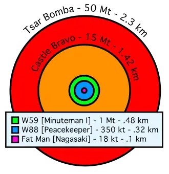 | 31. října 1961 | Car Bomba | 50 000 | SSSR | Největší termonukleární zbraň, jaká kdy byla testována – oproti původnímu návrhu o hmotnosti 100 Mt byla zmenšena o 50 %. |