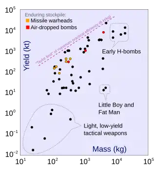 | „Fat Man“ (svržená na Nagasaki) | 19–23 | 79–96 | Implozní štěpná bomba s plutoniem-239 (druhá ze dvou jaderných zbraní používaných ve válce). | 6.2 kg plutonia-239, pouze u 1 kg došlo ke štěpení |