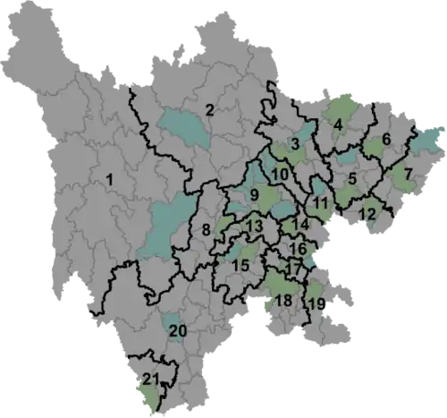| 2 | Ngawa (tibetský a čchiangský) | 阿坝藏族羌族自治州 རྔ་བ་བོད་རིགས་ཆ་བ༹ང་རིགས་རང་སྐྱོང་ཁུལ་ |