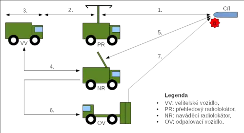 - Data o cíli jsou předána do naváděcího radiolokátoru NR.