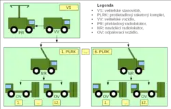 - Přilétající cíl je zachycen přehledovým radiolokátorem PR.