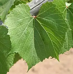 První dva mladé lístky jsou bronzově zbarvené, středně silně pavučinovitě ochmýřené, často celokrajné, s podehnutými okraji, další listy jsou třílaločnaté s mělkými výkroji, zelené s lehkým bronzovým nádechem, ochmýření postupně slábne. Dospělý list je středně velký až velký, klínovitý až skoro čtvercového tvaru, nečleněný, tří- až pětilaločnatý s mělkými výkroji, na líci tmavozelený, hladký až mírně vrásčitý, slabě obrvený, na rubu světle zelený, hladký, řapíkový výkroj je široce otevřený, ve tvaru „U“ až lyrovitý, většinou s oblým dnem, ale výjiměčně i se zaostřeným dnem, řapík je silný, jemně obrvený, u řapíkového výkroje růžovofialový, je kratší než střední žíla listu.