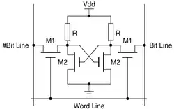 Typická buňka SRAM je tvořena šesti tranzistory typu MOSFET. Každý bit v paměti SRAM je uložen na čtyři tranzistory (M1, M2, M3, M4), kteří tvoří dvě křížové spojení měřiče. Tato skladovací buňka má dva stabilní stavy, které jsou použity k označení 0 a 1. Další dva přístupové tranzistory slouží k řízení přístupu k paměťové buňce během čtení a zápisu. Kromě tohoto typu SRAM jsou další druhy čipů SRAM například 4, 8, 10 (4T, 8T, 10T SRAM).[3][4][5] Čtyřtranzistorová SRAM je docela běžná v samostatných zařízeních SRAM (oproti SRAM používané pro CPU cache), realizované ve speciálních procesech s extra vrstvou polykrystalického křemíku, což umožňuje velmi vysokou hodnotu Pull up rezistoru.[6]. Obecně platí, že čím méně tranzistorů na buňku, tím menší každá buňka může být.