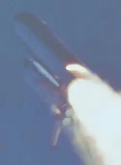 - T + 65 sekund: Plamen poškodil hlavní palivovou nádrž ET, unikající vodík začal pomalu hořet.