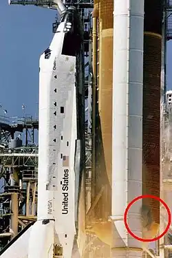 Jak se později ukázalo, už krátce po startu zaznamenaly sledovací kamery něco, co nebylo úplně v pořádku. Jednalo se o malý obláček černého dýmu (viz obrázek vpravo) z netěsnosti, která se objevila v čase +0,445 sekund. Nacházel se zhruba v oblasti spodního spoje pravého motoru SRB s nádrží ET. Podle počítačových simulací v tomto místě došlo k největšímu proudění vzduchu a tím pádem i k největšímu poklesu teploty na povrchu raketoplánu. Netěsnost způsobila ztrátu pružnosti gumových kroužků mezi jednotlivými segmenty motoru. Do takto vzniklé štěrbiny vnikly spaliny a začaly přepalovat gumové těsnění a vnější kryt motoru. Tento dým sledovaly kamery až do 12. sekundy letu, kdy se škvíra působením aerodynamických sil sama na chvíli utěsnila.