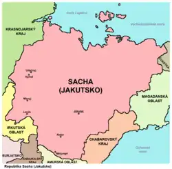 | Sacha (Jakutsko) Республика Саха (Якутия) (Respublika Sacha (Jakutija)) Саха Өрөспүүбүлүкэтэ (Sacha Öröspüübülükete) | |