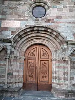 Mohutný románsko-gotický kostel svatého Michaela a částečně zřícené budovy kláštera stojí na vrcholu strmého Monte Pirchiriano s převýšením asi 570 m, kam se vystupuje klikatou křížovou cestou. Její závěr tvoří 243 schodů, podél nichž se pohřbívali řeholníci. Schody končí před slavnostním vchodem do kostela, románským portálem se zvěrokruhem. Kostel je velmi dobře zachovaná kamenná trojlodní stavba v přechodném románsko-gotickém slohu s malou kryptou. Loď je zaklenuta čtyřmi poli křížové klenby s žebry a navazuje na románský presbytář. Na stěnách jsou cenné raně renesanční fresky.