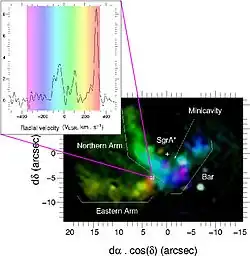 Západní oblouk (mimo zorné pole obrázku napravo) je interpretován jako vnitřní ionizovaný povrch CND. Východní rameno a tzv. Bar jsou pravděpodobně dalšími velkými mračny, která jsou podobná severnímu ramenu, ovšem nesdílejí společně s ní stejnou oběhovou rovinu. Hmotnost každého ramena byla odhadnuta na 20 hmotností Slunce.