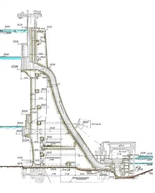 Vybudování vodního díla si vyžádalo výkopové práce o objemu 7 200 m³ v zemi a 37 000 m³ ve skalním masivu. Bylo uloženo 9 720 m³ betonu a železobetonu. Celková hmotnost kovových konstrukcí a mechanismů je 114 300 tun.