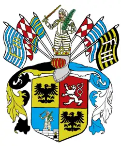 "Čtvrcený štít. V prvním a čtvrtém zlatém poli černá, do středu hledící orlice s červeným jazykem. Druhé pole je červené se stříbrným dvojocasým kráčejícím lvem. Ve třetím modrém poli stříbrná, černě spárovaná zeď, za kterou vyniká vpřed hledící muž ve stříbrné, zlatě lemované zbroji s přílbou s otevřeným hledím. V pravé ruce nad hlavou drží plamenný meč se zlatým jílcem a záštitou, v levé, která je opřena v bok, zelenou palmovou ratolest. Nalevo od něj naráží do zdi hořící granát. Na štítě stojí korunovaná turnajská přílba s černo-zlatými a modro-stříbrnými přikrývadly. Klenotem je rostoucí oděnec ze štítu mezi šesti praporci (3:3) na stříbrných ratištích se stříbrným hrotem. Vpravo: přední stříbrno-modře pruhovaný se stříbrnými literami F III, druhý červeno-stříbrně routovaný, zadní zlato-modře pruhovaný. Vlevo: přední černo-zlatě pruhovaný se stříbrnými literami F III, druhý modro-zlatě pruhovaný, zadní stříbrno-červeně routovaný."