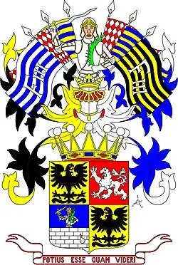 Baronský erb se od původního lišil jen korunou svobodných pánů na štítě a heslem POTIUS ESSE QUAM VIDERI.[8]