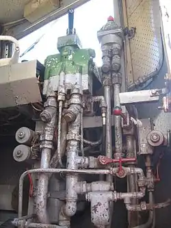 Rozvaděč nákladního vozu – zleva připojena táhla přestavovače G-P (nahoře) a uzavíracího kohoutu brzdy (dole). V popředí táhlo ručního odbrzďovače.