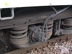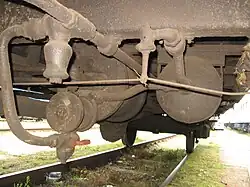 Vůz původní řady Ztr s tlakovou brzdou Božič s typickou baňkou rozvodového vzduchojemu a s ramenem opřeným o ložiskovou komoru pro regulaci brzdy dle zatížení vozu