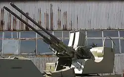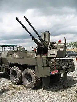 Lafeta s kanóny je konstruována jako snímatelná, což umožňuje použití tohoto systému ve stacionárním provedení. Z korby mohla být spuštěna po dvou rampách pomocí navijáku.[3] Kanóny mají odměr celých 360° a náměr v rozsahu od −2° do +85°. Dálkový dosah střelby byl 3000 m na vzdušné a 2000 m na pozemní cíle.[1] K ničení vzdušných cílů primárně sloužila tříštivo-trhavá munice a proti pozemním cílům mohla být použita i munice průbojná. Celková zásoba munice byla 800 nábojů. Polovina se nacházela přímo v zasouvatelných zásobnících po padesáti nábojích. Zbytek byl uložen ve schránkách. K zaměřování nejprve sloužil kruhový zaměřovač s muškou a dalekohled.[3]