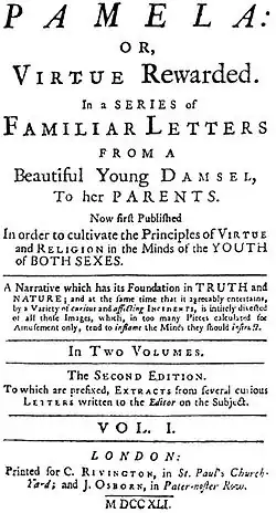Roku 1739 byl požádán svými přáteli, aby napsal svazek vzorových dopisů, které měly sloužit jako předlohy pro méně vzdělané pisatele. Byl mezi nimi i stylizovaný dopis otce dceři pracující jako služebná, když se dozvěděl, že její pán usiluje o její čest, a dopis s dceřinou odpovědí. Tato situace jej následně zaujala natolik, že jí rozvedl do samostatného psychologického románu v dopisech Pamela, or Virtue Rewarded (1740, Pamela aneb Odměněná ctnost), pro nějž je charakteristický ponor do nitra postav, psychologická introspekce a výrazný didaktický záměr, který je typický i pro jeho další díla.[2]