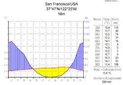 Pro San Francisco jsou typické mírné deštivé zimy a suchá, ale nepříliš horká léta. Vzhledem k tomu, že je město ze tří stran obklopeno vodou, je sanfranciské klima silně ovlivněno studenými proudy Tichého oceánu, což přináší jen malé rozdíly mezi teplotami během roku. Průměrné letní teploty se pohybují do 21 °C. Nejvyšší teplota, která kdy byla v San Franciscu naměřena, bylo 39 °C 14. června 2000. Zimy jsou mírné s teplotami kolem 15 °C. Teploty většinou nikdy nesestoupí k 0 °C, s výjimkou nejnižší zaznamenané teploty −3 °C, která byla naměřena 11. prosince 1932. Nejvíce sněhu ve městě napadlo 5. února 1887, kdy leželo v ulicích centra města 9,4 cm sněhu, v ostatních částech San Francisca to bylo 17,8 cm. Poslední měřitelné sněžení bylo 5. února 1976, kdy na většinu území města napadlo 2,5 cm sněhu.