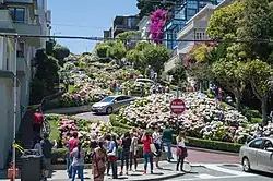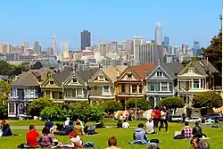 ![]() ![]() ![]() ![]() ![]() ![]() Odshora: řadové domky na náměstí Alamo Square s panoramatickým pohledem na město v pozadí, Lombard Street, lanová tramvaj, Pier 39, duhová vlajka ve čtvrti Castro, Golden Gate Bridge | |
