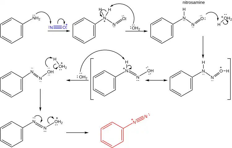 Kyselina dusitá použitá při reakci se obvykle připravuje těsně před použitím z dusitanu sodného a kyseliny. Při reakci nejprve dojde k dvojnásobné deprotonaci a k odštěpení vody za vzniku nitrosoniového iontu, který následně při reakci s aromatickým nebo heterocyklickým aminem, například anilinem, slouží jako elektrofil. Při tomto druhém kroku se vytvoří nitrosamin.[5] Reakce nejčastěji probíhají za takovýchto podmínek:[7][8]