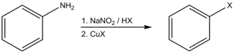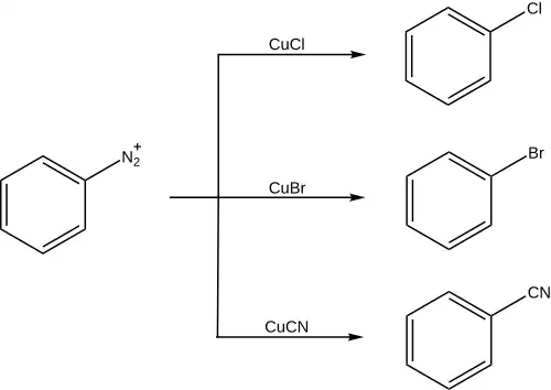 Chlorace: ArN2+Cl–, CuCl, HCl (36% vodný roztok), 50 – 100 °C; bromace: ArN2+HSO4–, CuBr, HBr (48% vodný roztok), 50 – 100 °C; kyanace: ArN2+Cl–, CuCN, KCN, H2O, benzen, 0 °C; hydroxylace: Cu2O, Cu(NO3)2, H2O, 25 °C.