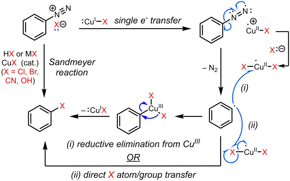 Sandmayerova reakce patří mezi radikálově-nukleofilní substituce. Radikálový průběh dokládá detekce biarylových meziproduktů.[9] Substituce aromatické diazoskupiny halogenem nebo pseudohalogenidem je iniciována přenosem jednoho elektronu, který je katalyzován měďnou solí, a vzniká při něm za odštěpení dusíku arylový radikál.[10][11][12][9] Poté se vytvoří substituovaný aren přenosem Cl, Br, CN nebo OH z měďnaté sloučeniny na arylový radikál a současně dojde k obnovení katalyzátoru. Jinou možností je vznik měditého meziproduktu spojením arylového radikálu s měďnatou sloučeninou a rychlá redukční eliminace za tvorby konečného produktu a obnovení katalyzátoru.[13][14][15] Důkazy o vzniku organické sloučeniny mědi v průběhu reakce jsou však slabé[16][17] a přesný průběh může záviset na volbě substrátu a reakčních podmínkách.