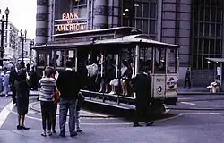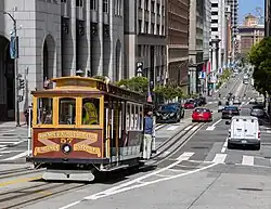 - Trať California Street neboli Kalifornská ulice, též linka 61 či C,[30] vede východním a západním směrem po Kalifornské ulici. Od konečné na křižovatce Kalifornské a Tržní ulice poblíž proslaveného nábřeží Embarcadero až k Van Nessově třídě (Van Ness Avenue). Tramvajové vozy, které jezdí po Kalifornské ulici, jsou delší a obousměrné, s pákami ovládajícími unášedlo na obou koncích. Mohou tedy jezdit po trati sem a tam a není třeba, aby se musely na konečné otáčet. Místo toho se koleje na konečné sbíhají do jediné. Trať bývala kdysi mnohem delší, vedla od křižovatky Kalifornské a Tržní ulice až k třídě Presidio (Presidio Avenue), ale provoz západně od Van Nessovy třídy byl v roce 1954 zrušen.[31][32] Čas od času sice zaznívají výzvy k obnovení tratě v její původní délce, ale prozatím nebylo navrženo nic seriózního. Tato trať vede pouze po Kalifornské ulici. Nejdřív stoupá do kopce k vrcholu Nob Hill neboli Kopci nabobů, poté sjíždí v mírném klesání ke konečné na Van Nessově třídě. Tuto tramvajovou linku využívají ve větší míře lidé dojíždějící do města do práce, takže ve všední dny tvoří většinu cestujících právě oni.[29]