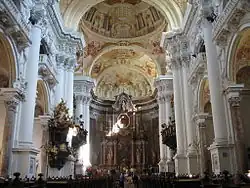 V kostele s kopulí nad křížením je mohutný hlavní oltář z červeného mramoru, vysoký 20 m, a bohatě vyřezávané barokní lavice. V kryptě je pohřbena poustevnice Wilbirgis, která žila přes 40 let blízko kláštera a zemřela roku 1289. Na kruchtě jsou slavné tzv. Brucknerovy varhany podle hudebního skladatele Antona Brucknera (1824–1896), který zde dlouho působil jako varhaník a pod kruchtou je také pohřben. Na věži je 8 velkých zvonů, čtyři nejstarší pocházejí z roku 1318, největší zvon z roku 1717 váží 8640 kg.