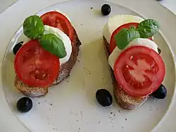 Bruschetta, topinka potřená česnekem, olivovým olejem a nakrájenými rajčaty