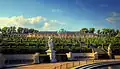 Svah byl rozčleněn do šesti širokých teras situovaných tak aby bylo co nejlépe využito dopadajících slunečních paprsků. Opěrné zdi posloužily pro osazení treláží, po kterých se pnuly keříky vinné révy dovezené z Portugalska, Itálie, Francie, ale také z německého Ruppinu. Zdivo bylo přerušováno 168 zasklenými nikami, v nichž rostly fíkovníky (smokvoně). Podél hrany každé terasy byl pruh udržovaného trávníku, ve kterém rostly tvarované tisy. Trávníky byly ohraničeny nízkým živým plotem ze zákrsků ovocných stromů. Středovou osu terasové zahrady tvoří schodiště se 120 schody, (dnes jich má 132), přerušované v úrovni jednotlivých teras a z obou stran pahorku byly k terasám přístupové rampy.