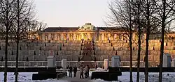 ![]() Zámek Sanssouci, střed jižního (zahradního) průčelí zámku s Atlasem a Karyatidami. | |