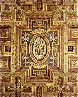 - Hlavní loď je plochostropá, má dřevěný kazetový strop s vyřezávanými emblémy a znaky papeže Řehoře XIII., je zlacený, s červenými a modrými poli;