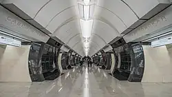 Co se designu stanice týče, hlavní myšlenkou zde bylo zdůraznit tubus metra, proto jsou kolejové stěny ničím nezkrášlené a nepokryté tubusy metra. Tubusy jsou vidět i na pylonech v hlavním sálu stanice, zde jsou přikryty průzračnými panely. Pomocí LED osvětlení, natření struktury tubusů v tmavé grafitové barvě a průzračných panelů na pylonech a podél okrajů nástupiště je dosaženo pocitu hloubky v prostoru. Materiály použité při výzdobě (šedý a bílý mramor, šedá a černá žula) kontrastují se strukturou tubusu, zdůrazňují jeho válcový obrys a návaznost.[2]